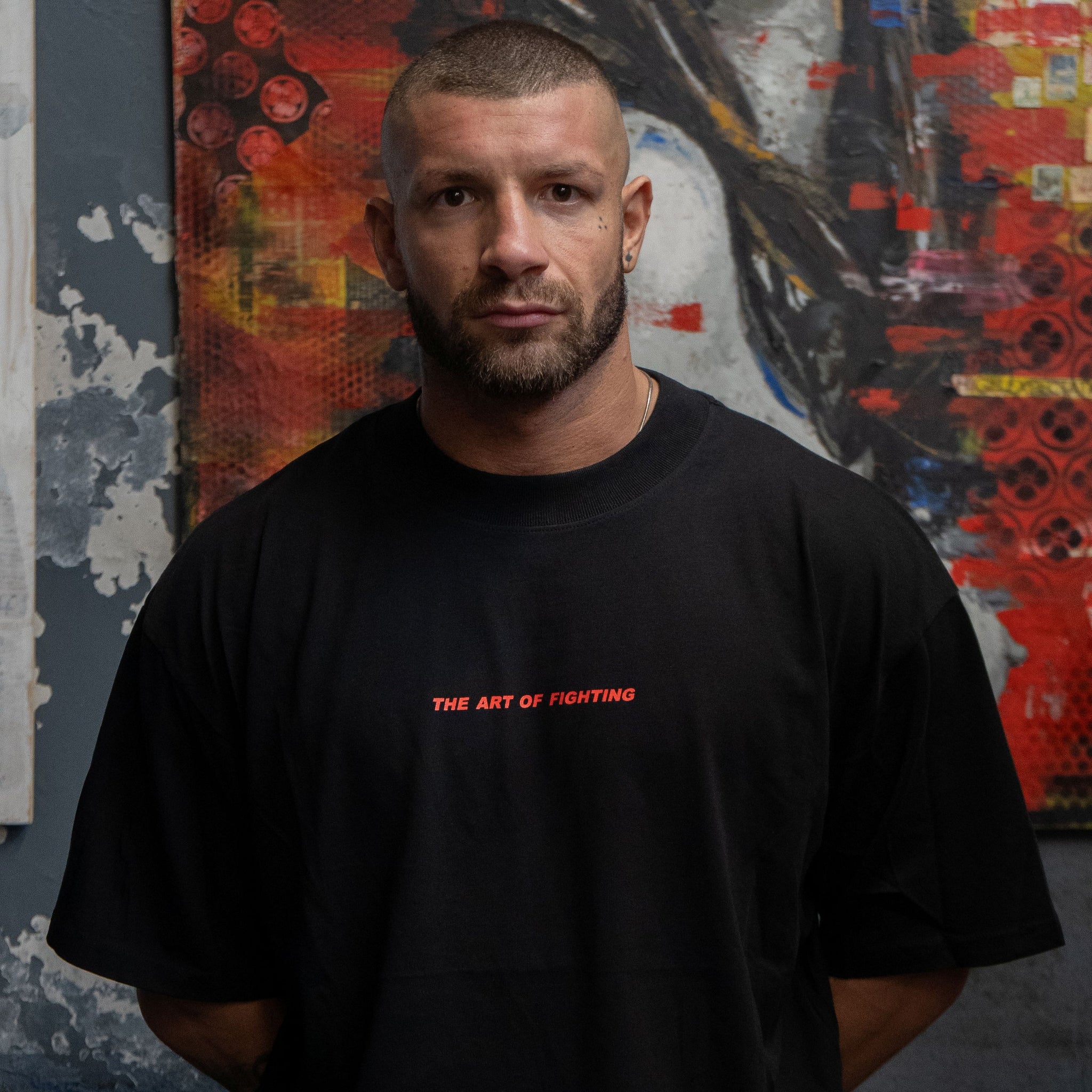 La T-shirt oversize TAF nasce per chi vive la strada come un ring: libera nei movimenti, forte nel carattere. Le spalle scese e il collo alto donano struttura, mentre il cotone biologico da 200 g/m² regala una sensazione di peso e qualità che si percepisce al primo tocco.